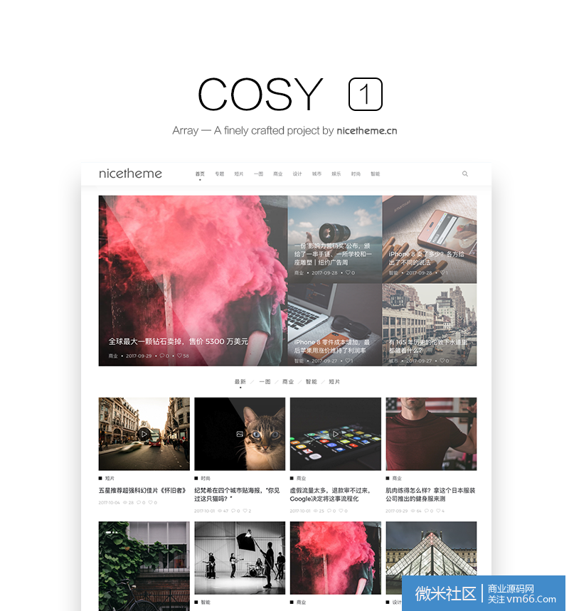 - 更大的幻灯片,更逼格的文章展示风格首页顶部提供2种展示文章方式,文章幻灯片展示和杂志式展示,任意切换