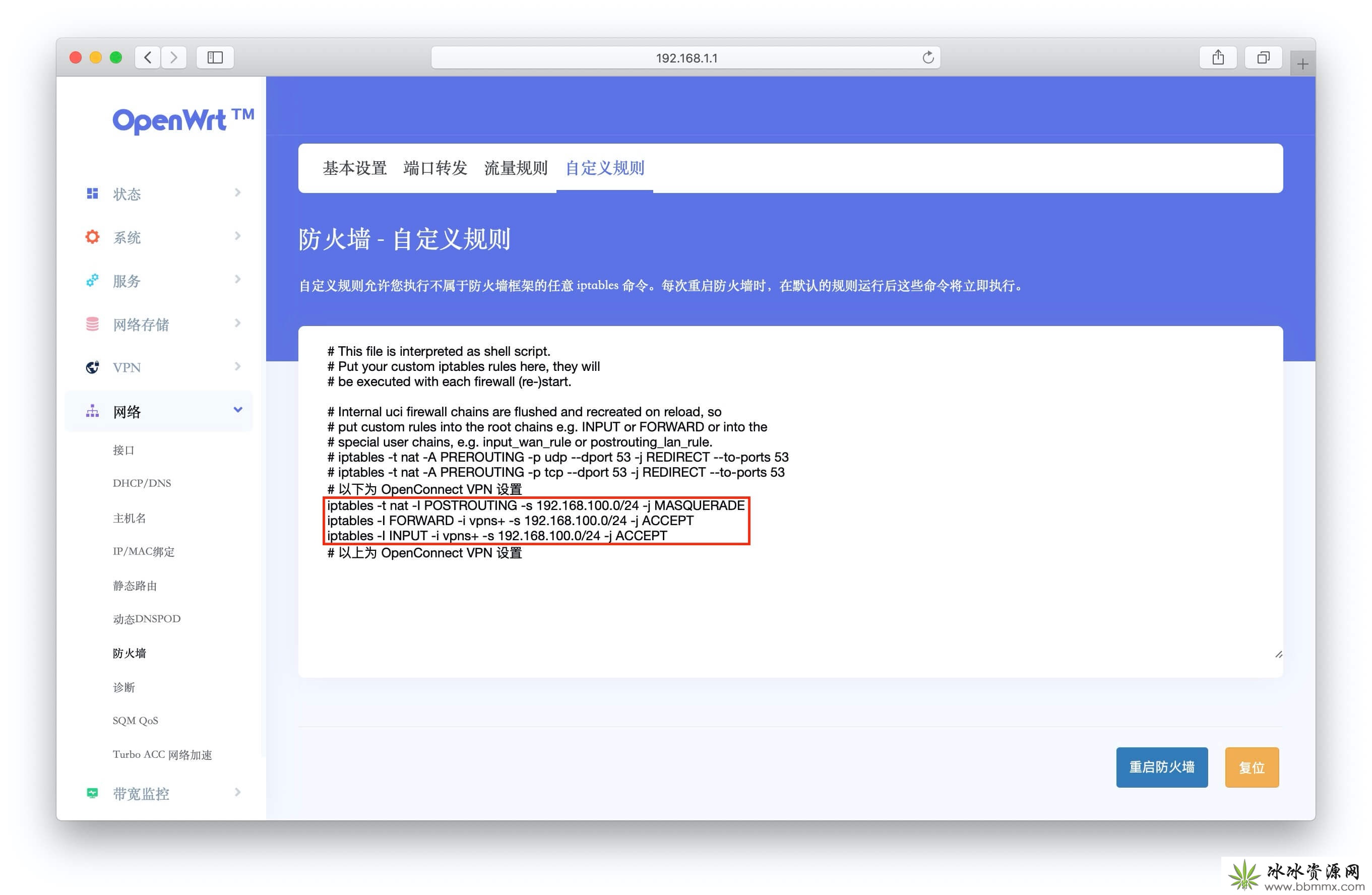 添加以下三条记录,允许客户端使用路由器转发流量,重启防火墙生效.